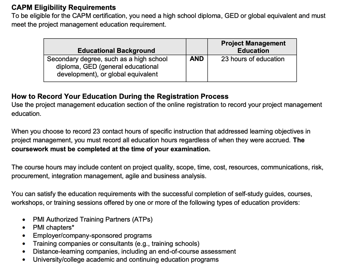To be able to sit PMI’s CAPM® exam, you need to prove to PMI that you fulfil the following prerequisites:
